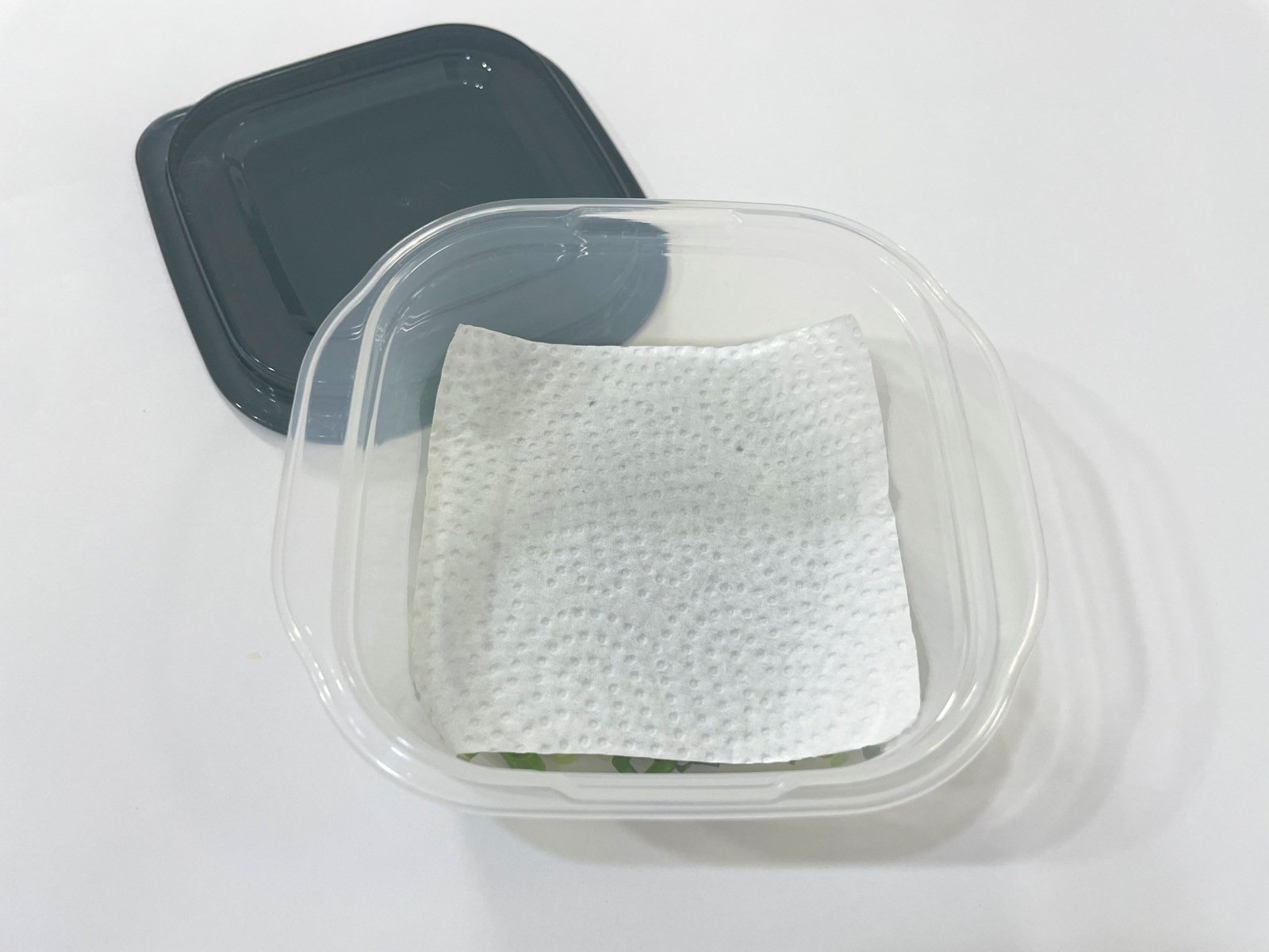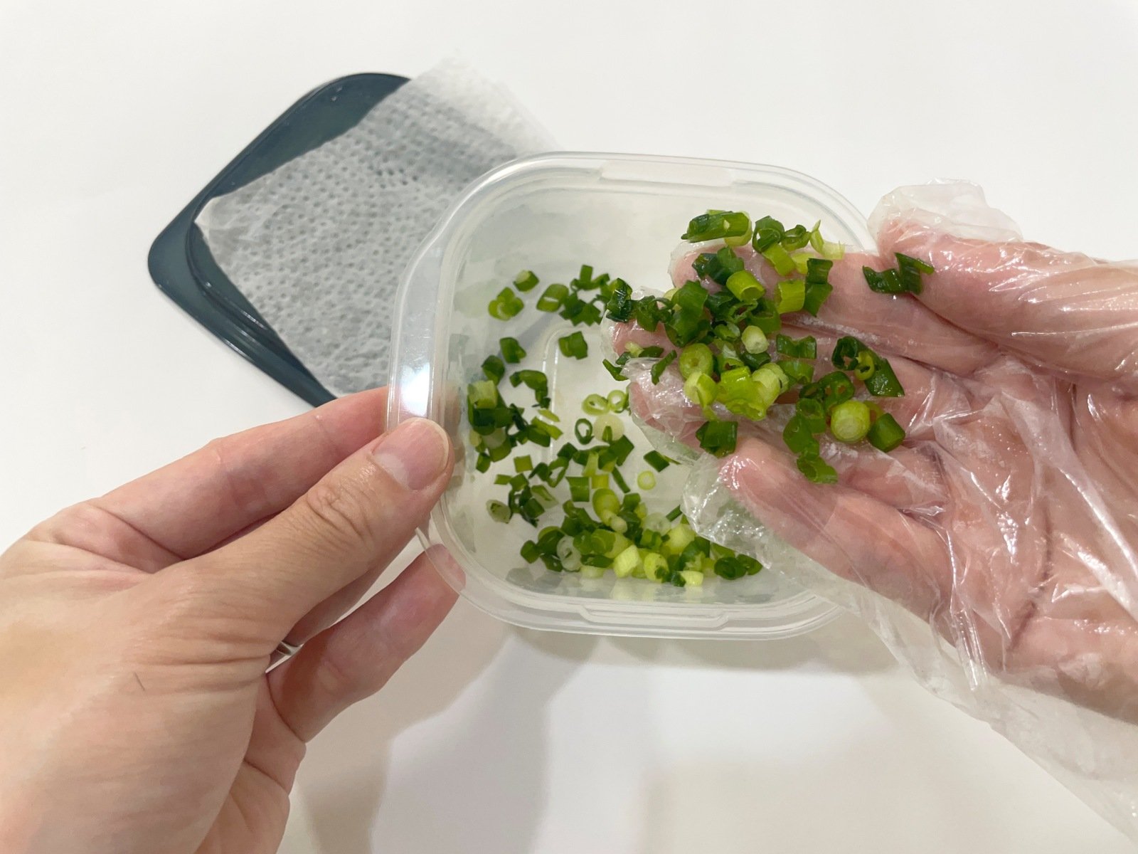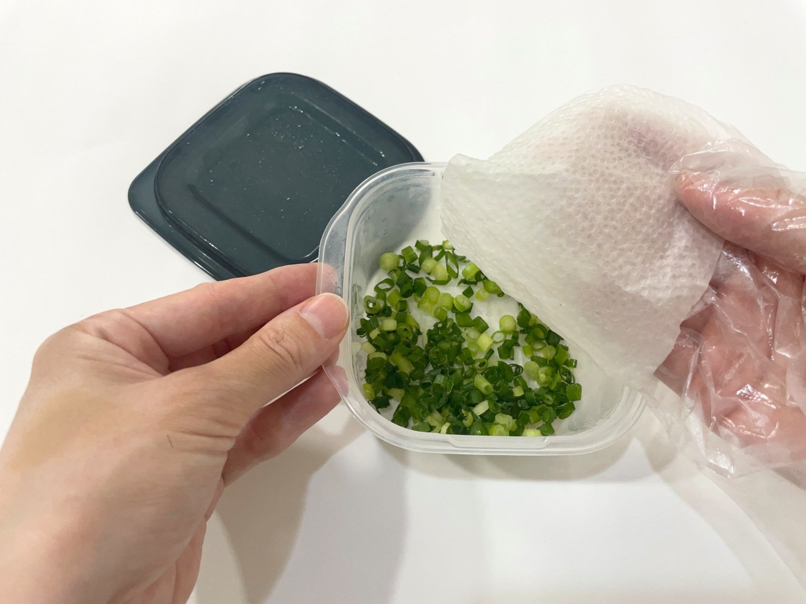 キッチンペーパーは下に敷くのではなく、上にかぶせるのがポイント。下に敷いてしまうと、上にのった小ネギをよけながらペーパーを引き出す必要がありますが、この方法ならフタを開けたときにサッとペーパーを取り出せます。効率的なアイデアですね!