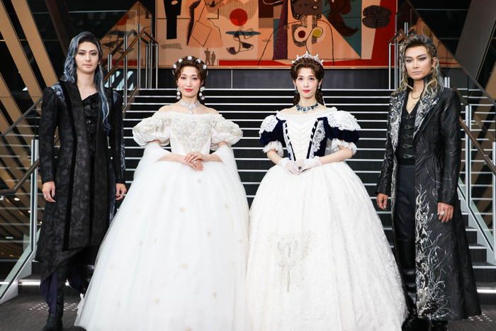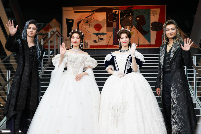 劇場ロビーで開催された囲み取材には、望海風斗、明日海りお、古川雄大、井上芳雄ら4名がきらびやかな舞台衣装を身にまとって登場した。