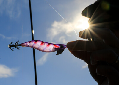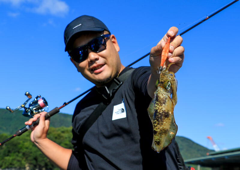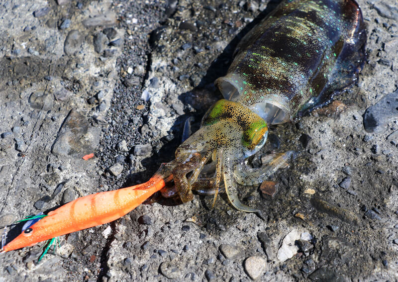 堤防の中間付近(深場とシャローの境)では、足下に小振りではあるもののイカの姿を10数杯確認することができました。エギをイカのそばにキャストするとすぐに反応して、2~3杯釣り上げることができるといった具合でした。