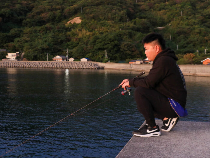 とはいえ時合ともなると、釣り人の気分的には回遊が多くありそうな外洋面での釣りをしたいもの。そのため、港の入り口付近のカケアガリ(ブレイク)のあるポイントに立ち位置を構え、回遊を待つことに…。日中に足下で見えていた個体は夕暮れを迎えるにつれて姿を消し、ブラインドでの釣りに挑みました。