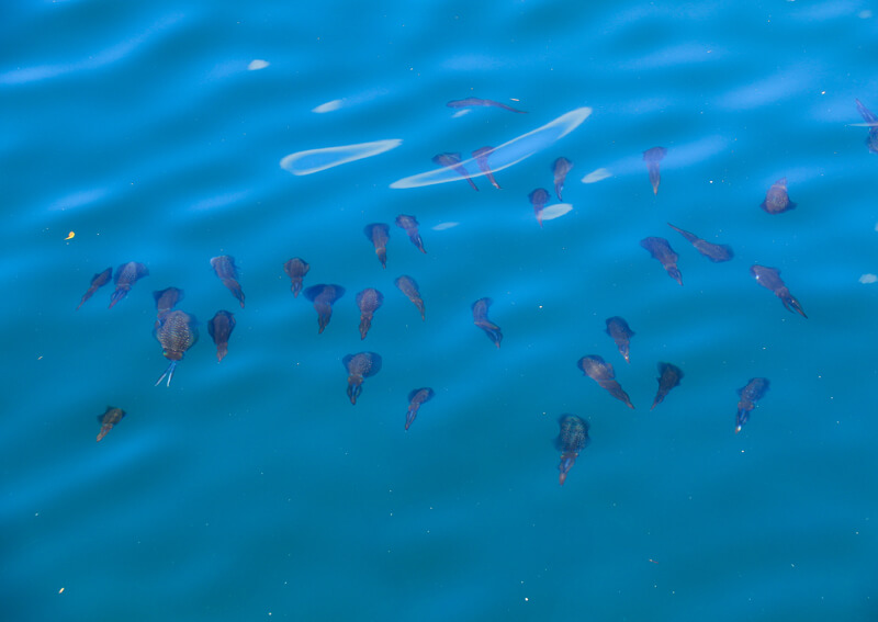 外洋に面した潮通しのよいエリアには、回遊魚(青物など)の姿が多く確認でき、イカの反応はイマイチ…。その反面、堤防際や港内にある船の牽引ロープの周りには、たくさんのイカが見えていました。