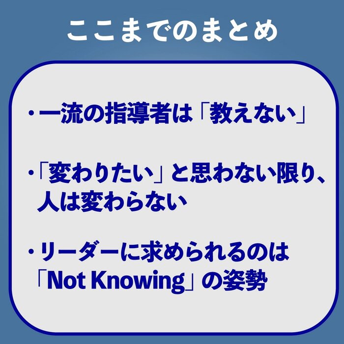 ── 「Not Knowing」のスタンスの大切さは理解できました。ただ、そうは言っても目の前で「明らかに自分のやり方と違うこと」をしている人を見ていると、やはり「なんとか助言してあげたい」と思ってしまいます。それをやめるためには、どうすればいいのでしょうか。