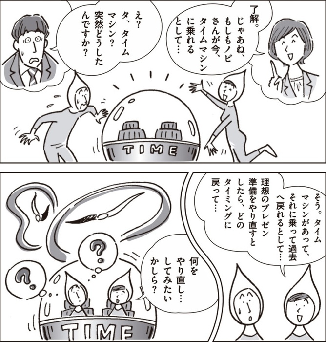 《画像:顧客へのプレゼンを失敗した部下に「もし過去に戻れるなら何をどうやり直したいか?」と問う、共創型の上司(『優れたリーダーはアドバイスしない』より。作画:中村知史)》