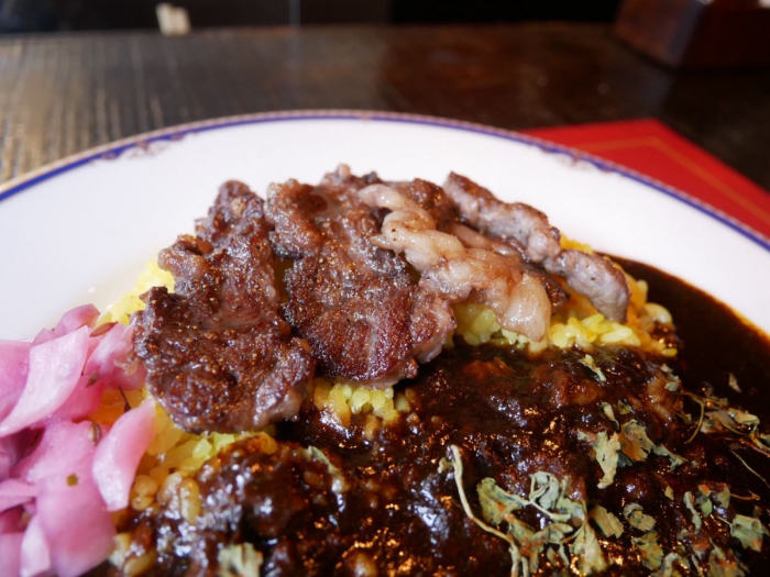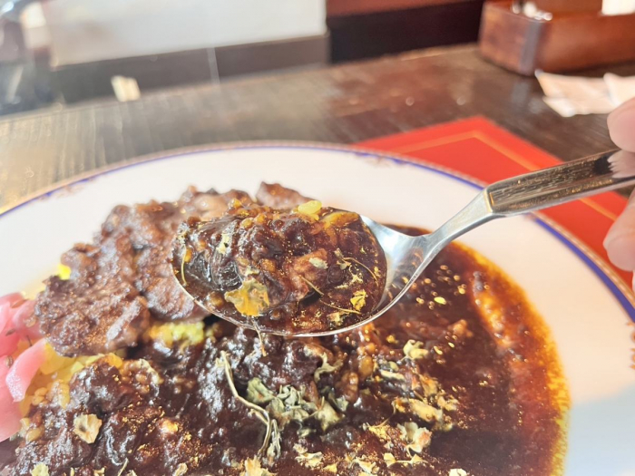 ルーは想像以上に濃厚で、コク深い味わいが口いっぱいに広がります。さらにルーの中にもお肉がたっぷり入っており、一皿でしっかりとした満足感を味わえるのが魅力です。