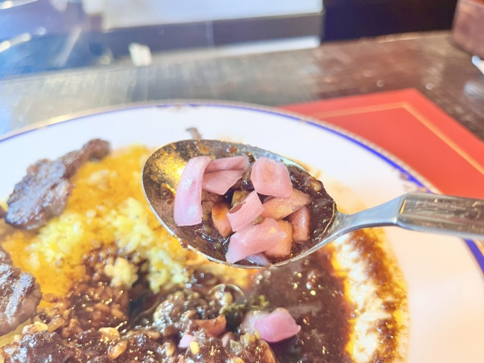 添えられている紫玉ねぎのピクルスは、すべてのカレーに付いています。シャキシャキとした食感とさっぱりとした酸味が特徴で、ルーやお肉と一緒に混ぜながら食べると、味にさわやかなアクセントが加わり、最後まで飽きずに楽しめます。
