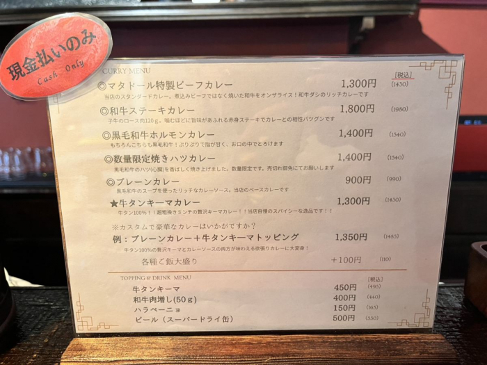 メニューはこだわりのビーフカレーをベースに、和牛ステーキカレーや黒毛和牛ホルモンカレーなど、バリエーション豊かな♪どのカレーも牛肉の旨味を最大限に引き出しており、食べ応え抜群です。