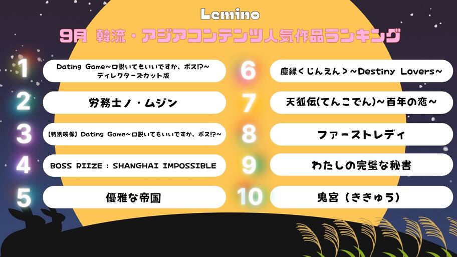 今月は、ヒューマン、ファンタジー、ロマンス、ホーム、時代劇、アクションとジャンルも幅広く、秋の夜長にぴったりの作品が揃った。
