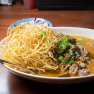 中太縮れ麺でコシ良好。ぷりぷりとした食感で、スープも良く絡み美味しい。好き嫌いは結構ありそうな予感ですが、我々的にはこれは面白い!と言う感想