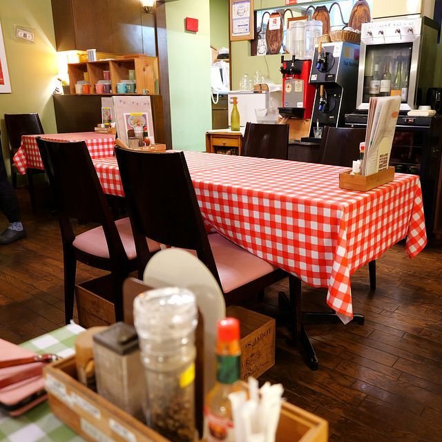 元フレンチの居抜き物件なのですが、そのままの雰囲気で運営中。4人掛けテーブルが4つ、2人掛けテーブルが3つのこじんまりですが、古典的ラーメン店では有りえないゆったりさ。