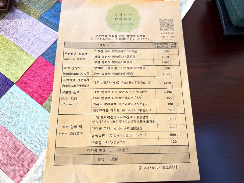 注文は、直接メニュー表に記入して店員さんに渡すシステム。あまり馴染みのないお茶の名前が並びますが、韓国産の素材を使ったヨモギ茶、漢方茶、伝統的な緑茶などが楽しめるようです。フードはかき氷、韓国餅がありました。