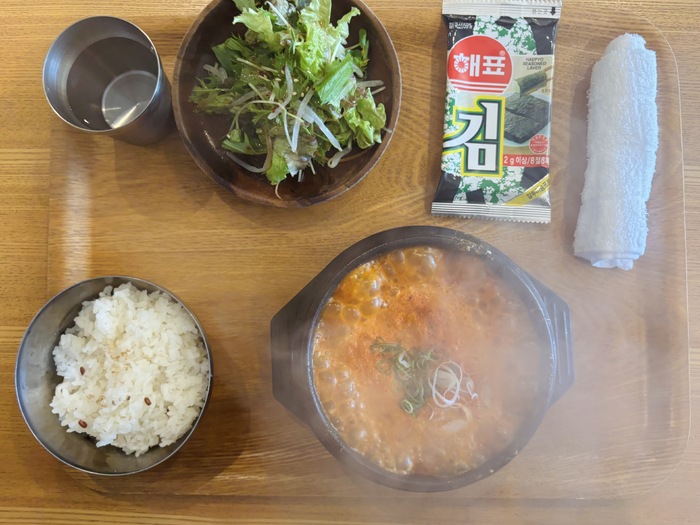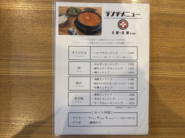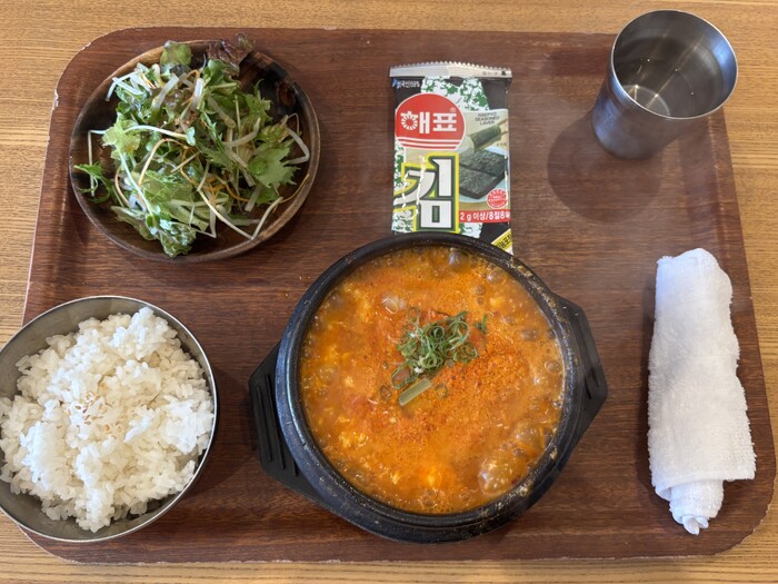 スンドゥブにご飯、サラダ、韓国のりがついています(ライスは小中大あり、春雨に変更も可能)