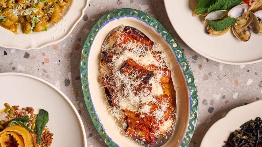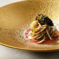 中央に添えられた生ブッラータチーズを割ると、とろりと流れ出しソースと一体化。赤と白のコントラストが美しく、味も見た目も贅沢な一皿です。