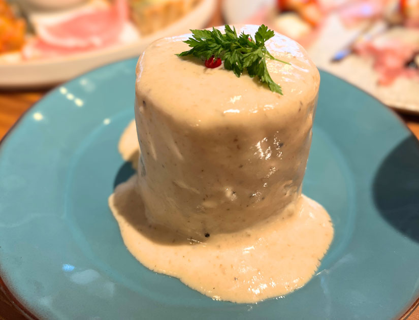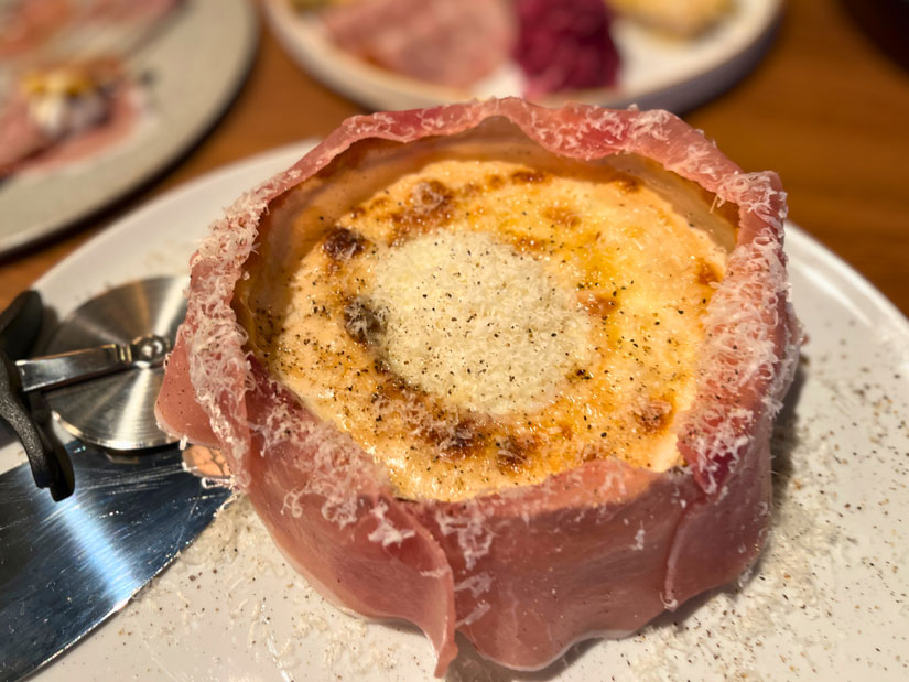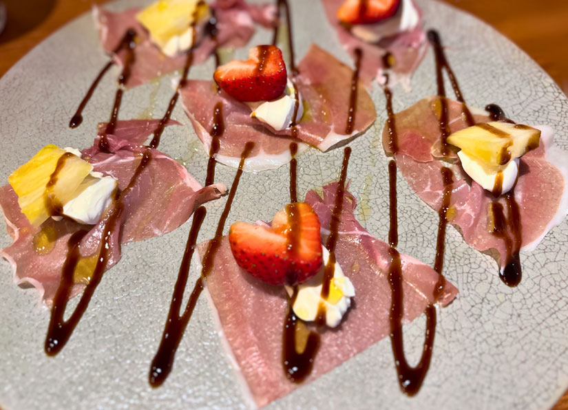 上品な塩気の生ハムに、みずみずしいフルーツの甘みとマスカルポーネのまろやかなコクが重なり合う、華やかな一皿。ひと口ごとに甘味と塩味が広がり、最後にバルサミコ酢ソースのほのかな酸味が全体をキリッと引き締める味わい。見た目も彩り鮮やか。