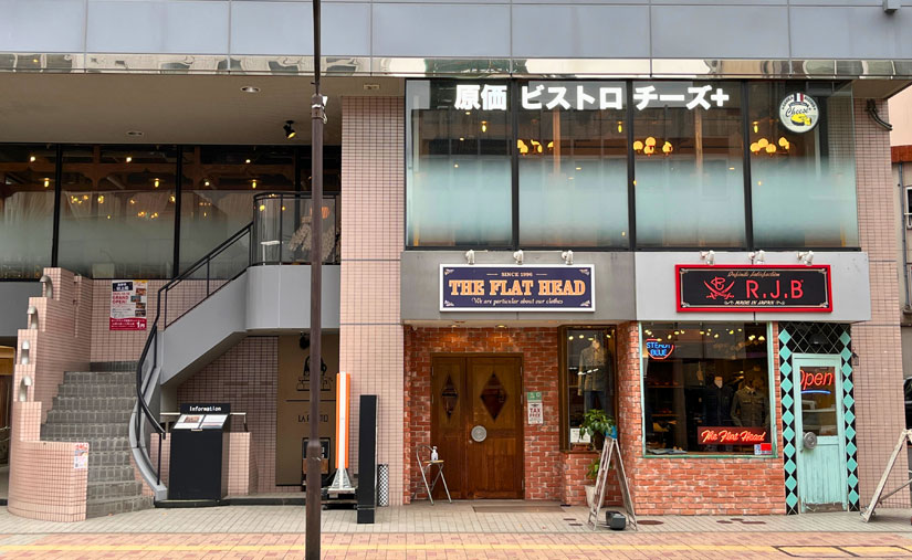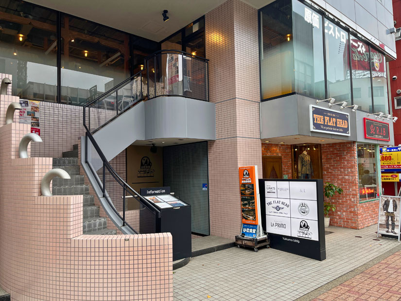 曲線階段と「原価ビストロ チーズ+」の光る看板が目印。