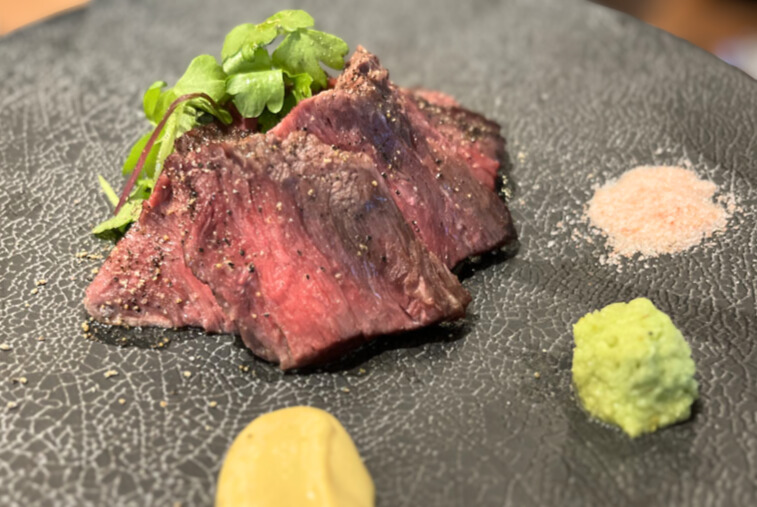 歯切れのよい柔らかさの中に、赤身ならではの力強い肉感がしっかりと感じられます。添えられた岩塩、わさび、マスタードを合わせれば、味の印象が一変。シンプルに肉のポテンシャルを味わうも良し、わさびやマスタードの刺激で引き締めるも良し。肉好きにはたまらない逸品です。