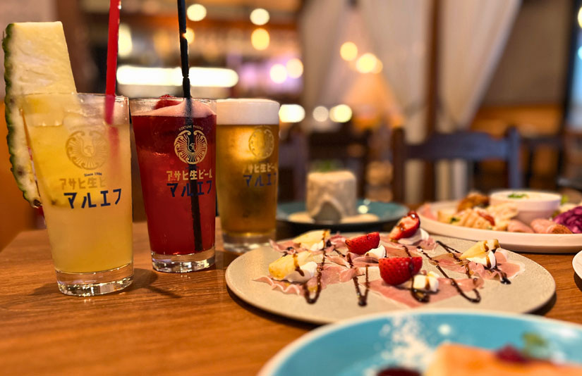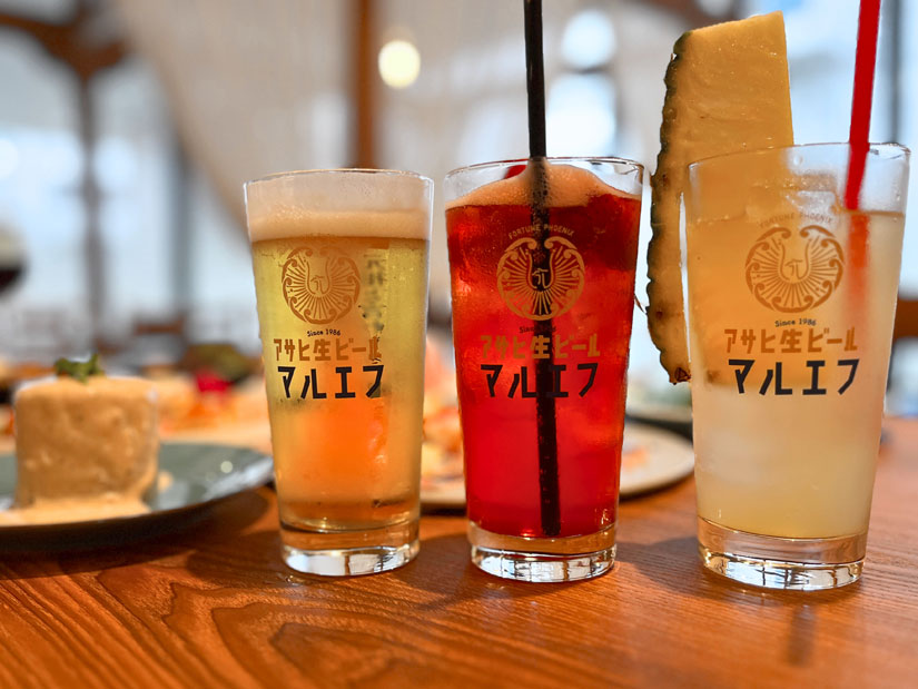 同店は約120種類ものアルコールがほぼ原価で楽しめるシステム。しかも、ソフトドリンクはなんと1円という驚きの価格設定。お酒を飲む人も飲まない人も、同じテーブルで気軽に楽しめるのが魅力です。写真は左から「アサヒ樽生マルエフ」(260円)「いちごたっぷりサワー」(385円)「パイナップルスパークリング」(308円)。