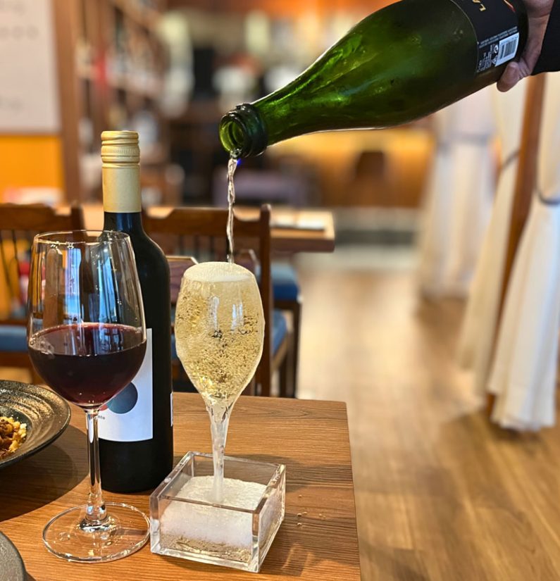 スタッフにスパークリングワインをなみなみ注いでもらえる「なみなみスパークリングワイン」(495円)。ワインは赤5種類・白6種類を用意。