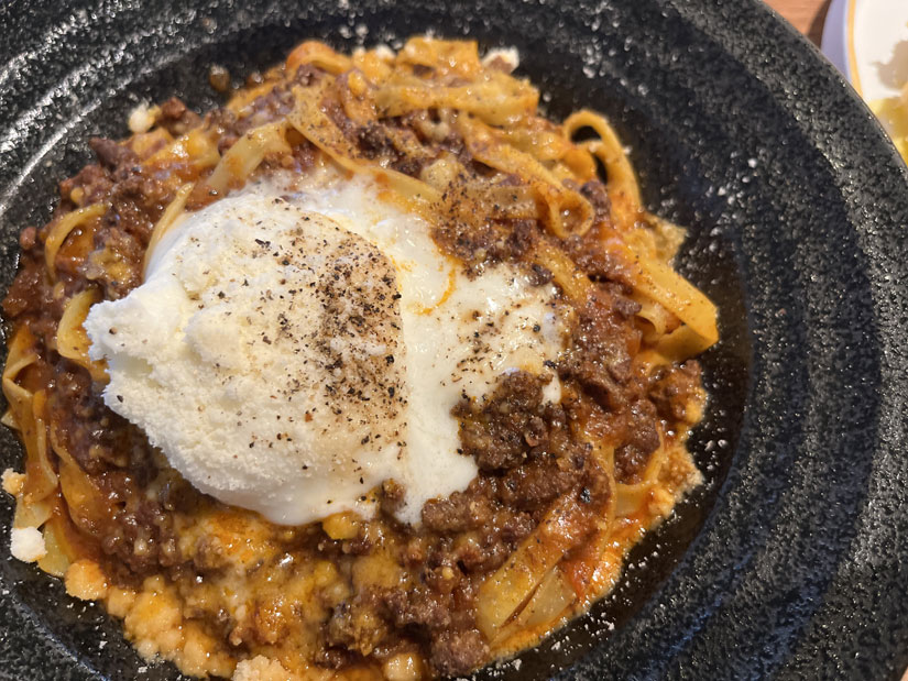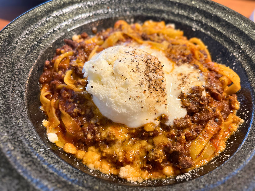 赤ワインでじっくり煮込んだボロネーゼは、肉の旨みと野菜の甘みが溶け合う奥深い味わい。幅広のパスタに濃厚なソースがしっかりと絡み、ひと口ごとに豊かな香りが広がります。