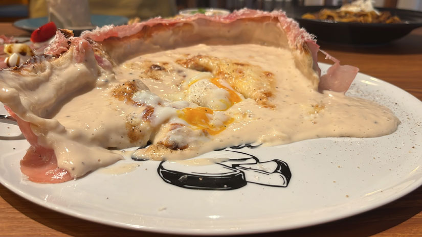 看板メニューの「生ハムと半熟卵のシカゴピザ」(2,178円)は、カットした瞬間にチーズがあふれ出す迫力の一皿。シュレッド・パルメザン・イタリア産モッツァレラの3種チーズをたっぷりと重ね、とろける温玉と生ハムの塩味が絶妙にマッチ。濃厚でクリーミーながら後味は意外と軽やか。断面から流れ出すチーズの滝は、思わずカメラを向けたくなる“映え必至”の光景です。