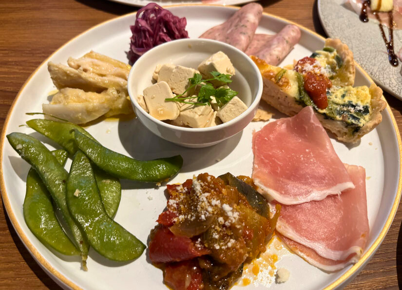 「生ハム」、パプリカや玉ねぎなどの野菜をトマトソースで煮込んだイタリアの郷土料理「カポナータ」、「枝豆のペペロンチーノ炒め」、「やげん軟骨のレモンソテー」、「紫キャベツのマリネ」、バジルの風味ただよう「イタリアンソーセージ」、「自家製キッシュ」、「クリームチーズのだし醤油漬け」の8品の前菜が一皿に。「クリームチーズのだし醤油漬け」は、お酒のおつまみにぴったりな濃厚な味わいで、単品での注文も可能(495円)。
