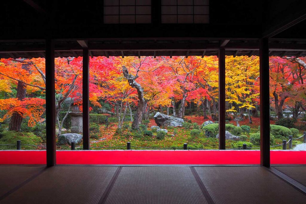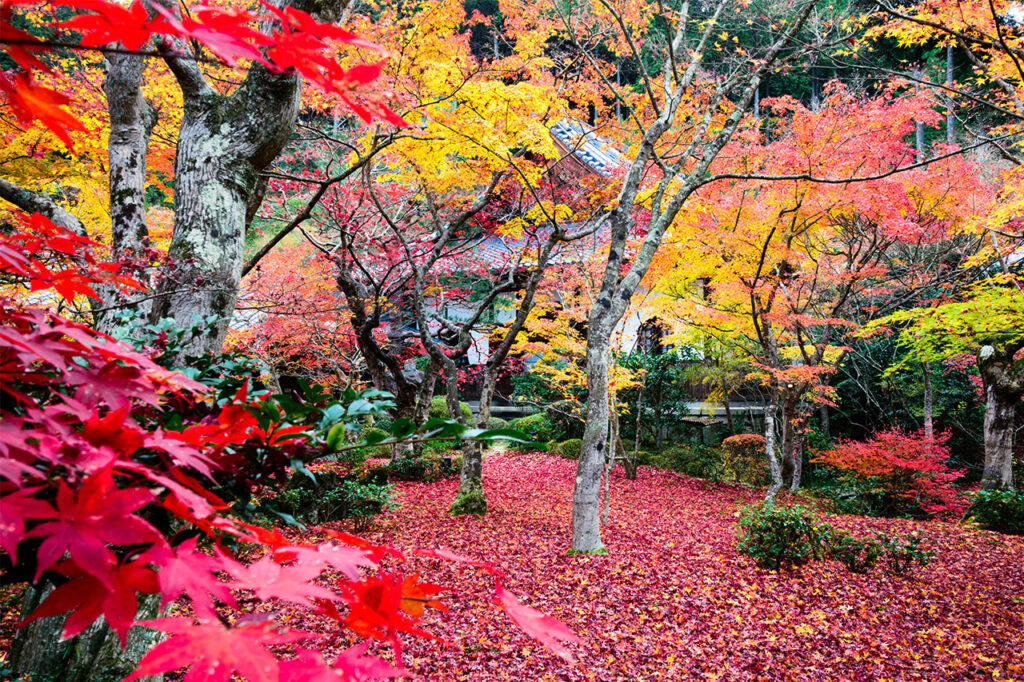 例年11月中旬から下旬にかけて紅葉し、境内の庭園ではカエデが鮮やかに色づく。敷き詰めた苔に赤や橙の葉が降り積もる姿は格別の美しさを誇る。