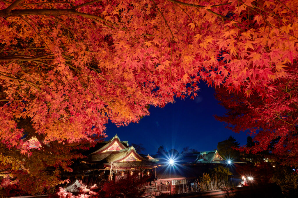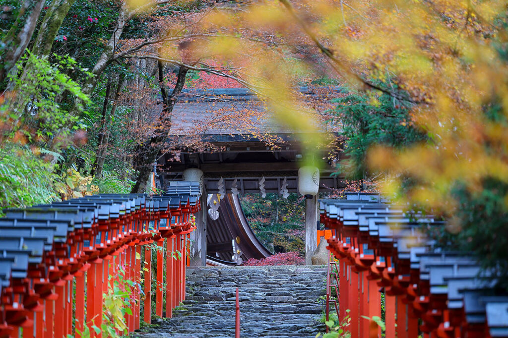 水の供給をつかさどる高龗(たかおかみ)の神を御祭神とする[貴船神社]。11月上旬には朱塗りの春日灯篭が並ぶ参道の頭上を紅葉のアーチが覆い、ひと際美しい空間を楽しめる。紅葉のライトアップでは、灯りに照らされたもみじが昼間とは違う美しさを放つ。