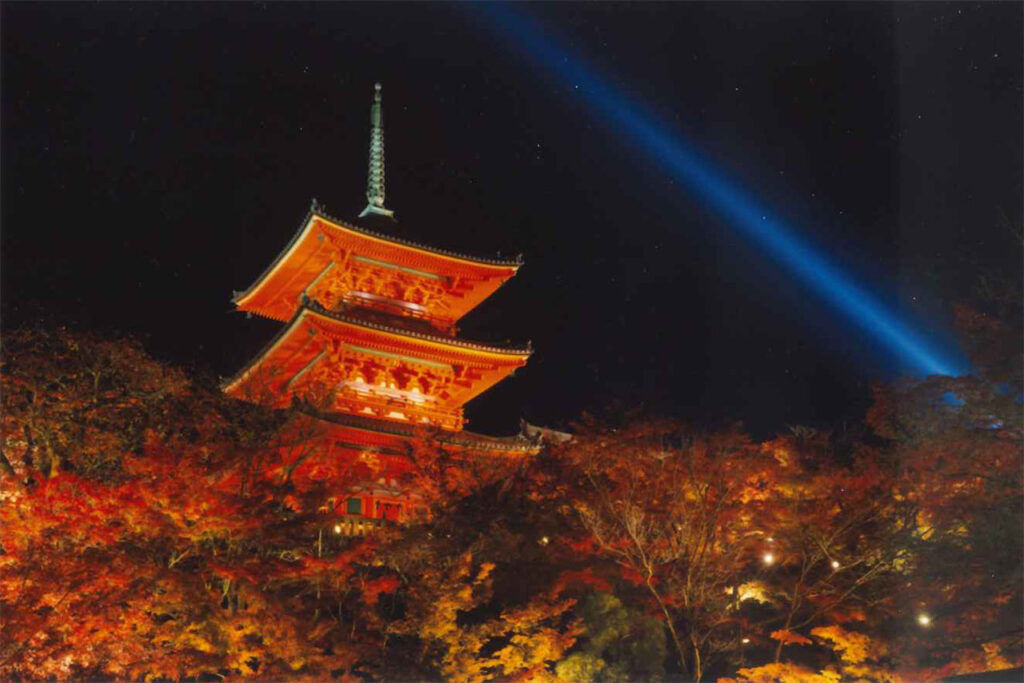 清水の舞台で知られる京都を代表する寺院の一つ[清水寺]。11月下旬から12月初旬にかけては、約1000本のモミジやヤマモミジが紅葉し、境内を赤く染め上げる。特に奥の院と清水の舞台で知られる本堂とのコントラストは必見。夜間の特別拝観では、境内がライトアップされ幽玄な雰囲気に包まれる。