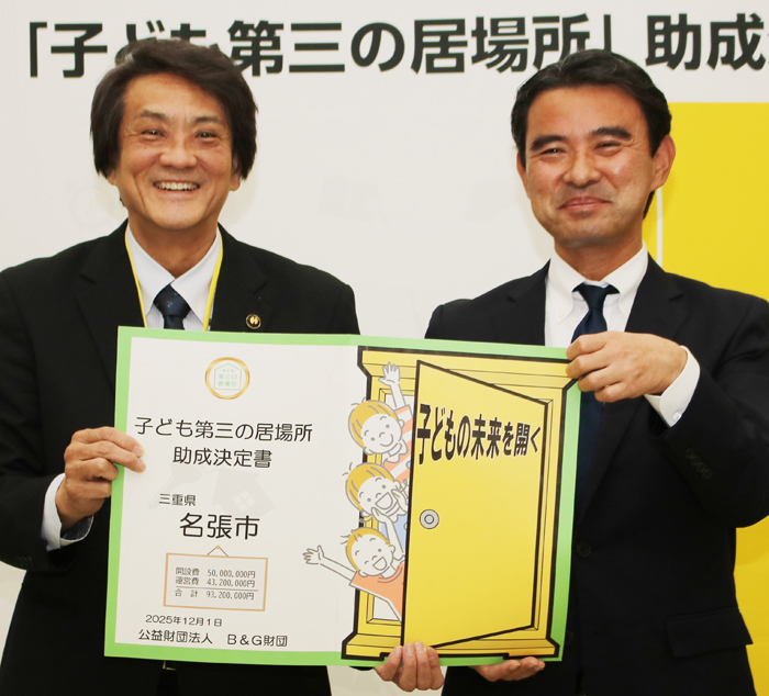 三重県名張市は、経済状況や家庭環境などに課題を抱える子どもらが学校や自宅以外で安心して過ごせる「子ども若者第三の居場所」を来年6月に開設する。B&G財団(東京都)による助成の決定書授与式が12月1日、市役所で開かれた。