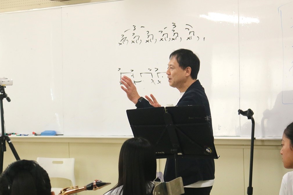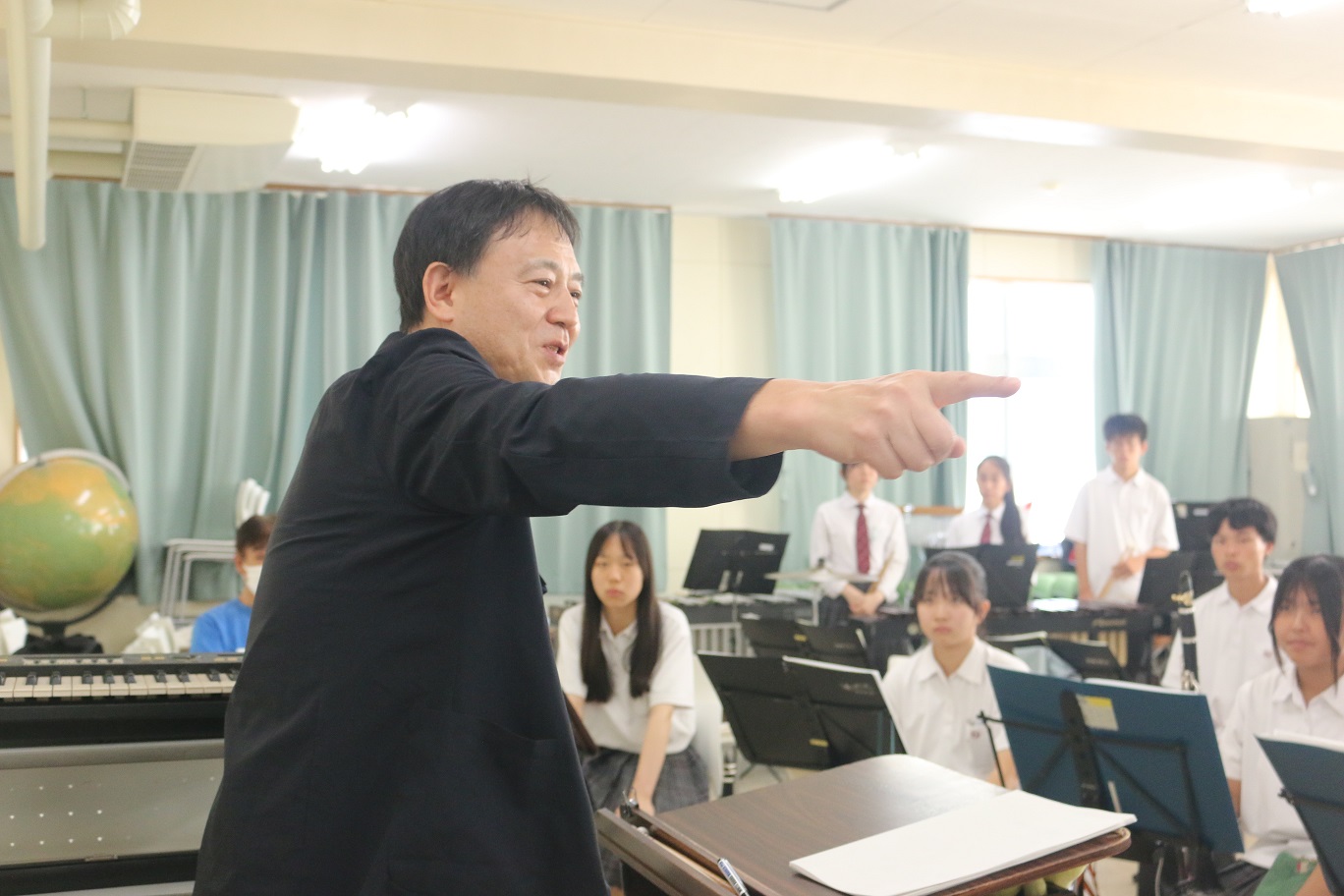 吹奏楽部の練習室に入ると、緊張した面持ちの部員が約40人。自己紹介もそこそこに「じゃあ、やってみてください」。エリック・オスタリング作曲の吹奏楽曲「バンドロジー」や英バンド「クイーン」の「ドント・ストップ・ミー・ナウ」などについて、さまざまなアドバイスを授けた。