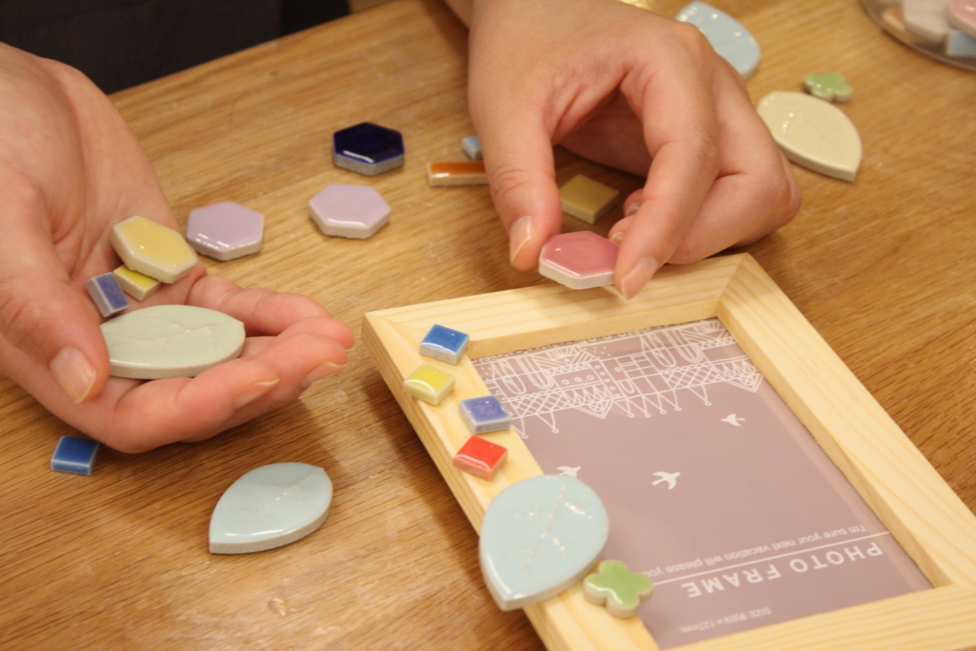 1階の体験工房では、さまざまな色や形のタイルを組み合わせて、フォトフレームやコースターなどオリジナルの小物が作れます(料金は500円、受付は15:30まで)