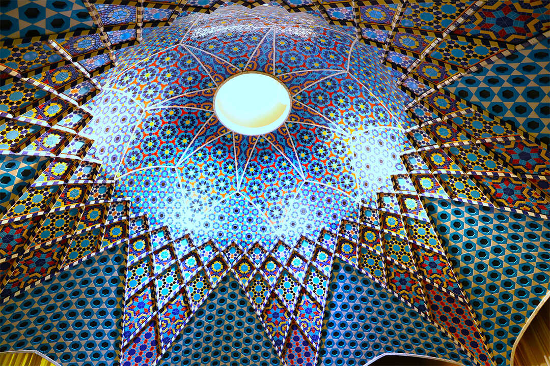 紀元前から近代まで7000点を超える装飾タイルが収蔵されている「世界のタイル館」で人気なのが「イスラームのドーム天井」。12種類5万ピースのモザイクタイルによる鮮やかな幾何学模様の天井は、ずっと見ていたくなる美しさ!
