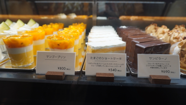 お店に到着すると、まず目に飛び込んでくるのはショーケースいっぱいに並んだスイーツたち。『たまごのショートケーキ』をはじめ、季節のショートケーキやシュークリームなどの生菓子がずらりと並びます。種類が豊富で、どれにしようか迷ってしまうほどです。