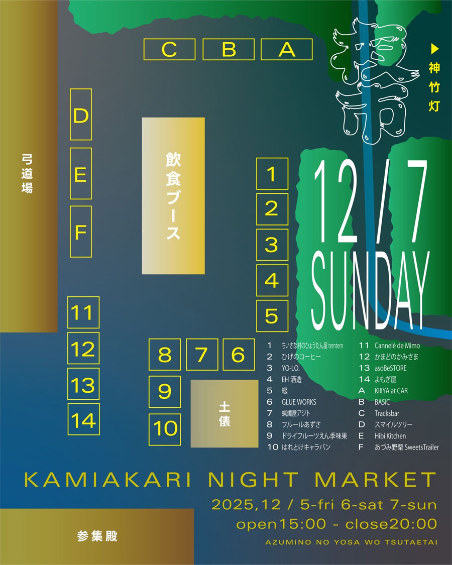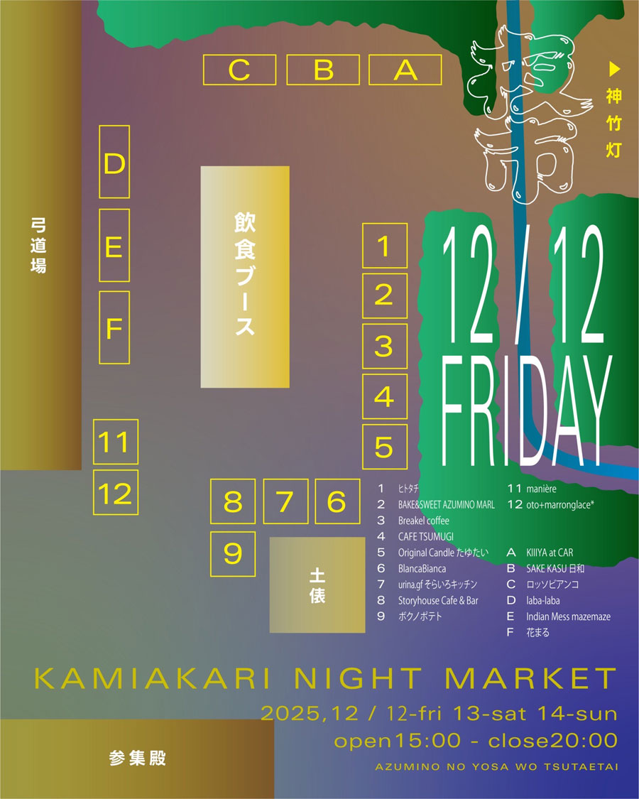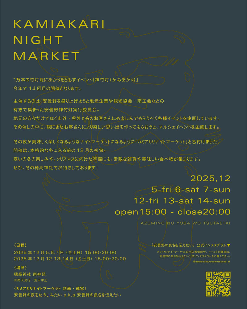 長野県安曇野市の穂高神社で、『カミアカリ ナイトマーケット/KAMIAKARI NIGHT MARKET~夜市~』が、2025年12月5日(金)・6日(土)・7日(日)・12日(金)・13日(土)・14日(日)の6日に渡り開催。