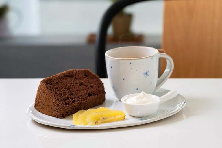 ふんわり軽やかな口当たりの特製シフォンケーキ+ドリンクセット(750円)。9種のドリンクから選べます。