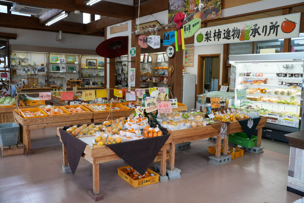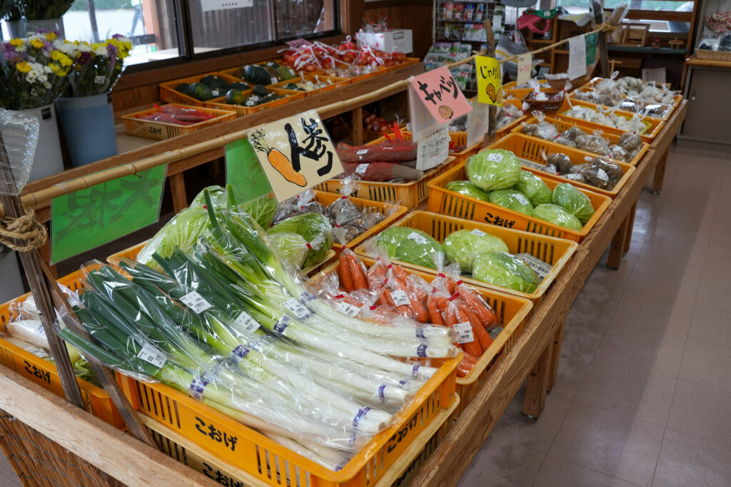中に入ると、あたたかみのある直売スペースに、色とりどりの野菜や果物がずらりと並んでいます。