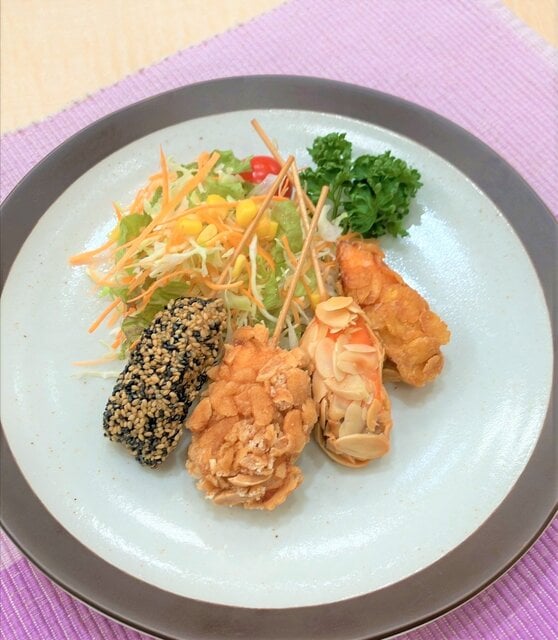 コーンフレークとアーモンドスライスは衣が剝がれやすいので、クッキングシートに包んで揚げるとよいです!