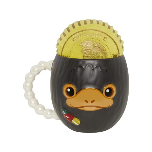宝物好きのいたずら者、ニフラーにインスパイアされたマグカップ。マグの側面には愛らしいニフラーの顔と、盗まれた宝石がデザインされており、持ち手部分は真珠のネックレス風に。マグの中には、ガリオンコインを模したぬいぐるみがすっぽりと収まっている、ニフラーが集めた宝物たちが詰まった遊び心いっぱいのデザインです。
