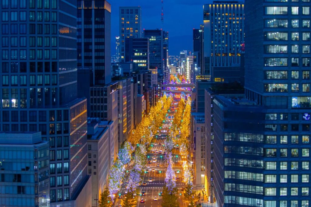 御堂筋のライトアップは季節やイベントに応じて特別イルミネーションが催されます。2025年は4月から年末まで「EXPO 2025 大阪・関西万博」に合わせた特別点灯を実施しています。