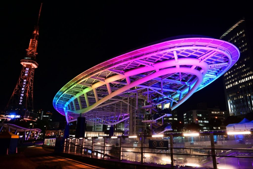 ターミナル駅「名古屋駅」に匹敵する利用者数を誇る地下鉄「栄駅」。夜になると、駅の真上に広がる久屋大通公園にそびえる高さ180mの「MIRAI TOWER(旧名:名古屋テレビ塔)」と、“水の宇宙船”と呼ばれるデザインの複合施設「オアシス21」が織りなすライトアップが楽しめます。