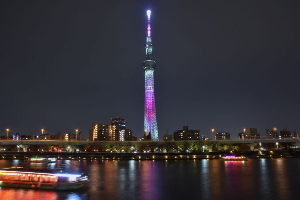 東京スカイツリーのライトアップは、水色と白に光る「粋」、江戸紫をテーマとした「雅」、橘色を基調に大きな旗のようなデザインの「幟(のぼり)」の3つのスタイルが用意されています。これらが毎日18時~24時の間に日替わりで点灯されます。