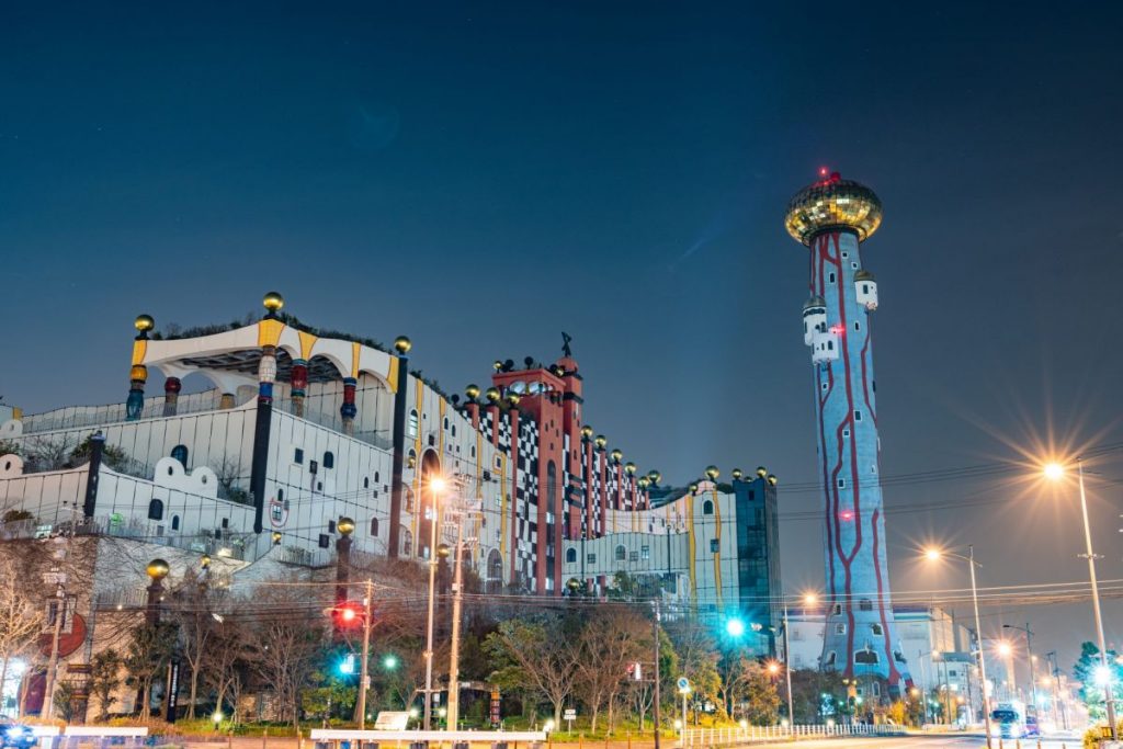 一見するとアミューズメント施設のように見える奇抜なデザインの建造物は、実は「大阪広域環境施設組合舞洲工場」というごみ処理場です。日中の姿もインパクトがありますが、夜になると淡い光に照らされて独特の雰囲気を醸し出します。