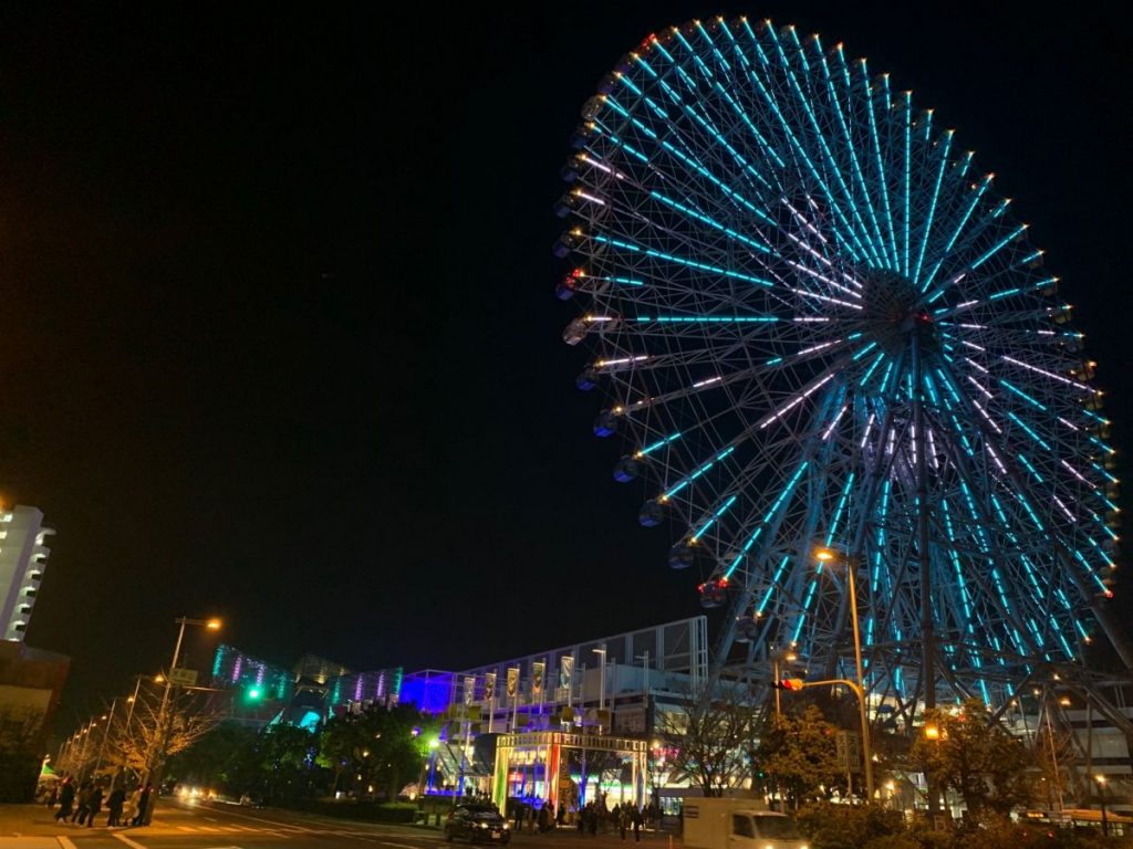「日本夜景遺産」(一般社団法人 夜景観光コンベンション・ビューロー)に認定されている天保山大観覧車のライトアップは、その美しさや艶やかさに加え、翌日の天気予報や現在時刻を知らせる演出が特徴です。イルミネーションで「あしたのてんき はれ」といった文字をスライド表示するユニークな表現や、魚のキャラクターが追いかけっこをする映像など、光のグラフィックアートが楽しめます。バリエーションも豊富なので、ぜひ現地でさまざまな映像美を味わってください。