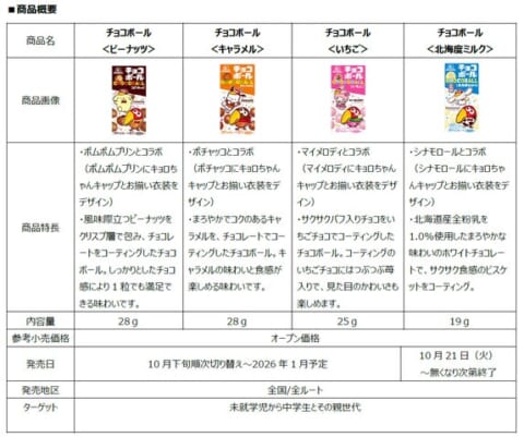 定番のチョコボール「ピーナッツ」「キャラメル」「いちご」も、期間限定でサンリオキャラクターズとのコラボレーションデザインパッケージで登場します。それぞれのパッケージには、ポムポムプリン、ポチャッコ、マイメロディがキョロちゃんとお揃いの衣装をまとった限定デザインが施されています。これらの限定デザインは2025年10月下旬より期間限定で発売されます。