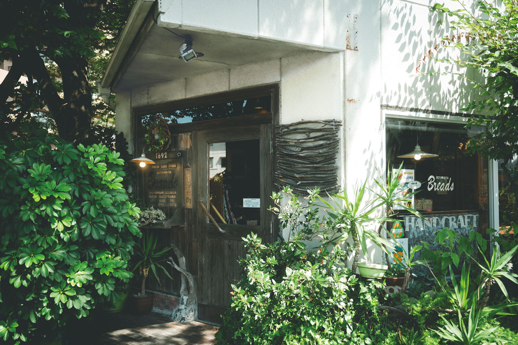 花や緑に包まれた外観は、まるで森の中の小さな隠れ家。木の枝をあしらった手づくりの装飾やアンティーク調の扉は、訪れる人にちょっとした非日常気分を味わわせてくれる。