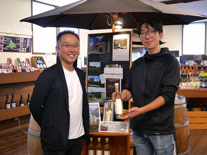 写真の右側に写っているのは、製造部の野吾さん。手に持っているのは、ケルナー100%の貴腐ワイン。
