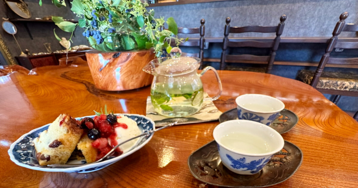 この日はたくさん実食!美しい器で運ばれて来た「胡桃とラムレーズンのパウンドケーキ」と「自家製フレッシュハーブティー」は、店内の雰囲気と調和して、食べるのがもったいない風情です。