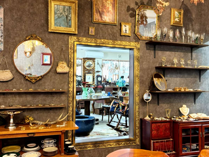 「かがりび」とサインのあるお店のガラス戸を開いて、思わず言葉を失いました。目の前に広がっていたのは、セピア色の優雅なシノズワリ空間です。まるでヨーロッパの小さな町にある骨董屋さんに入り込んだ気分。