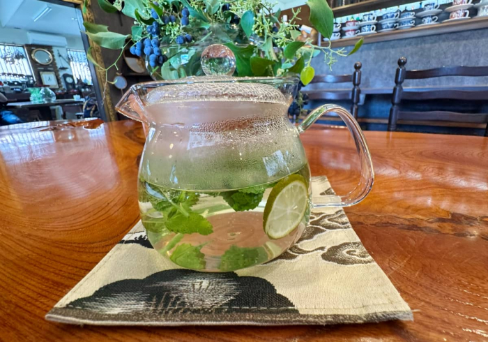 自家栽培のミントやレモンバーム等さまざまなハーブにすだちを加えたフレッシュハーブティーは、スッキリとした味わいが口の中に広がります。