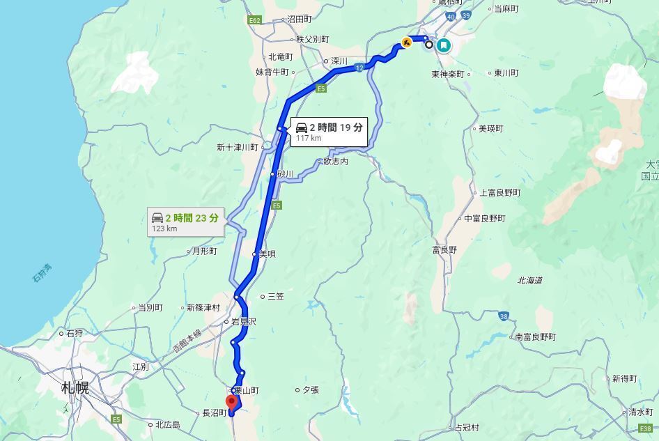 由仁町まで一般道だと寄り道せずに行くと2時間30分ほどで高速道路だと1時間30分くらいかな。