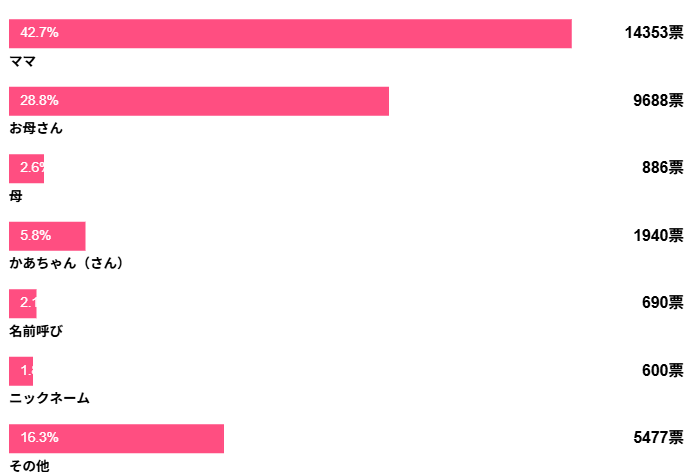 ママ:42.7% お母さん:28.8% その他:16.3% かあちゃん(さん):5.8% 母:2.6% 名前呼び:2.1% ニックネーム:1.8%